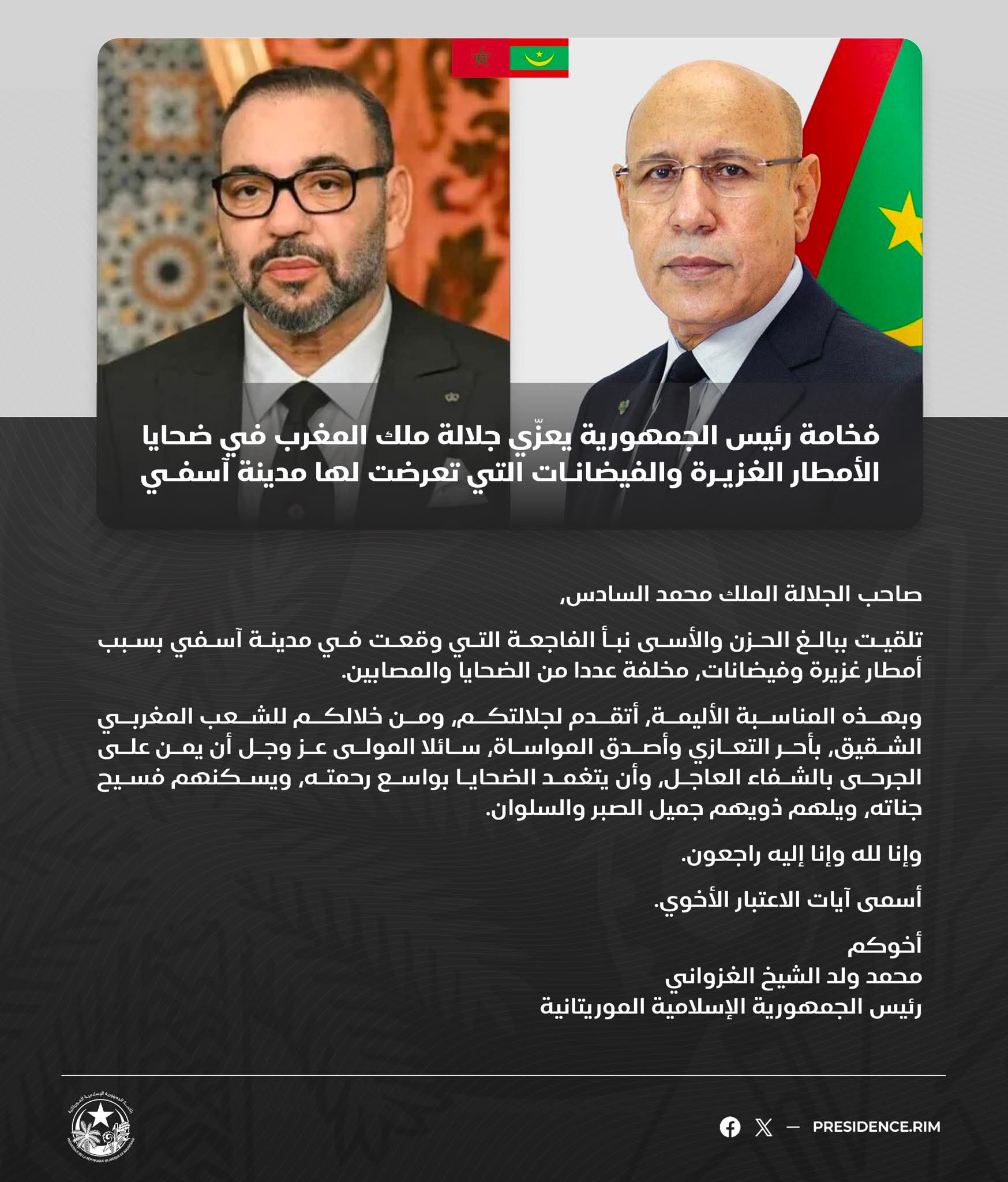 أعرب رئيس الجمهورية محمد ولد الشيخ الغزواني عن تعازيه للشعب المغربي في ضحايا الأمطار والفيضانات التي عرفتها مدينة آسفي بالمغرب.