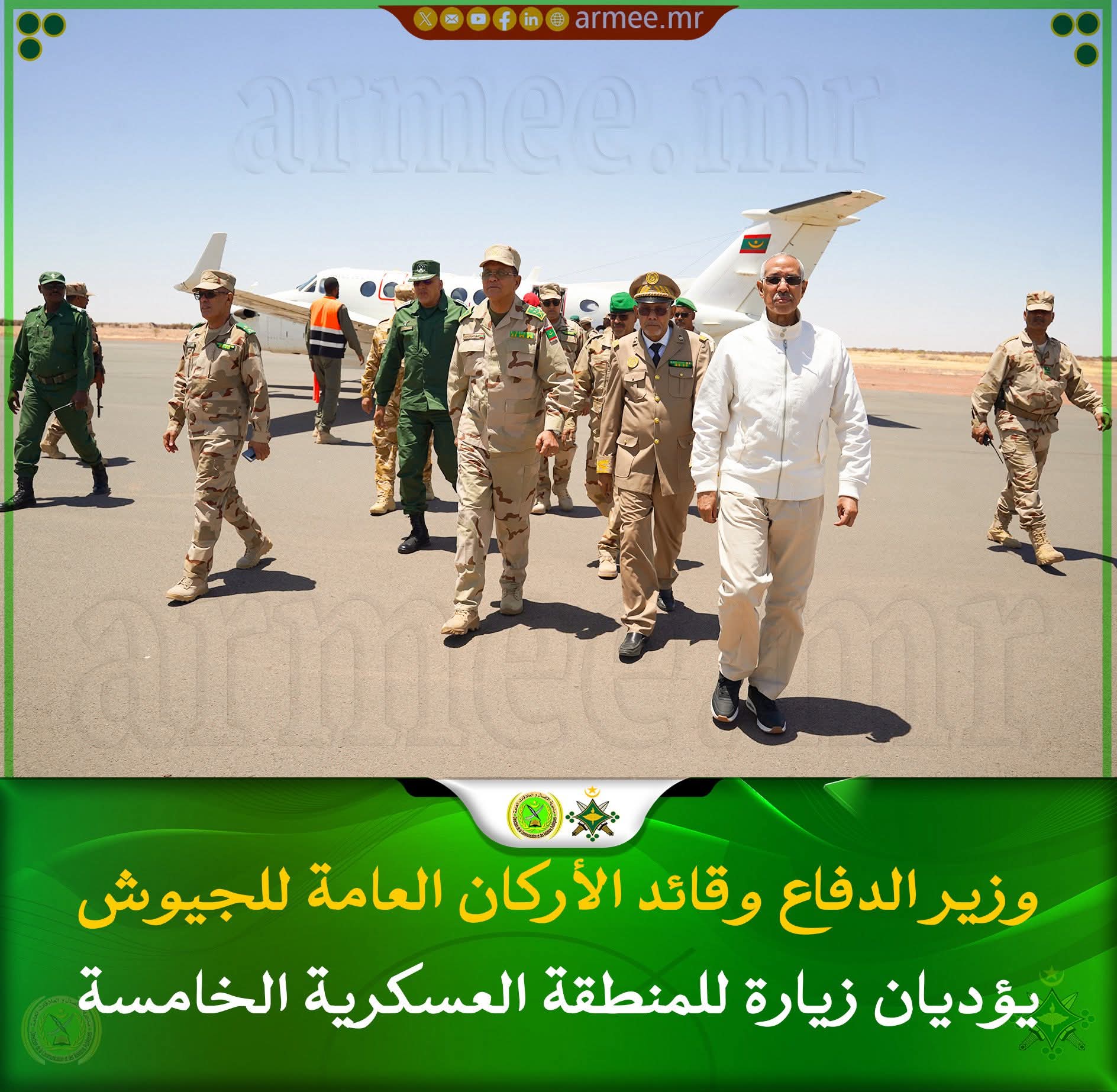 وصل وزير الدفاع وشؤون المتقاعدين وأولاد الشهداء؛ حنن ولد سيدي، وقائد الأركان العامة للجيوش؛ الفريق محمد فال الرايس الرايس، زوال اليوم الإثنين، مدبنة النعمة بولاية الحوض الشرقي، في مستهل زيارة لقطاع مسؤولية المنطقة العسكرية الخامسة، والكتيبة الموريتانية للقوة المشتركة لمجموعة دول الساحل الخمس.