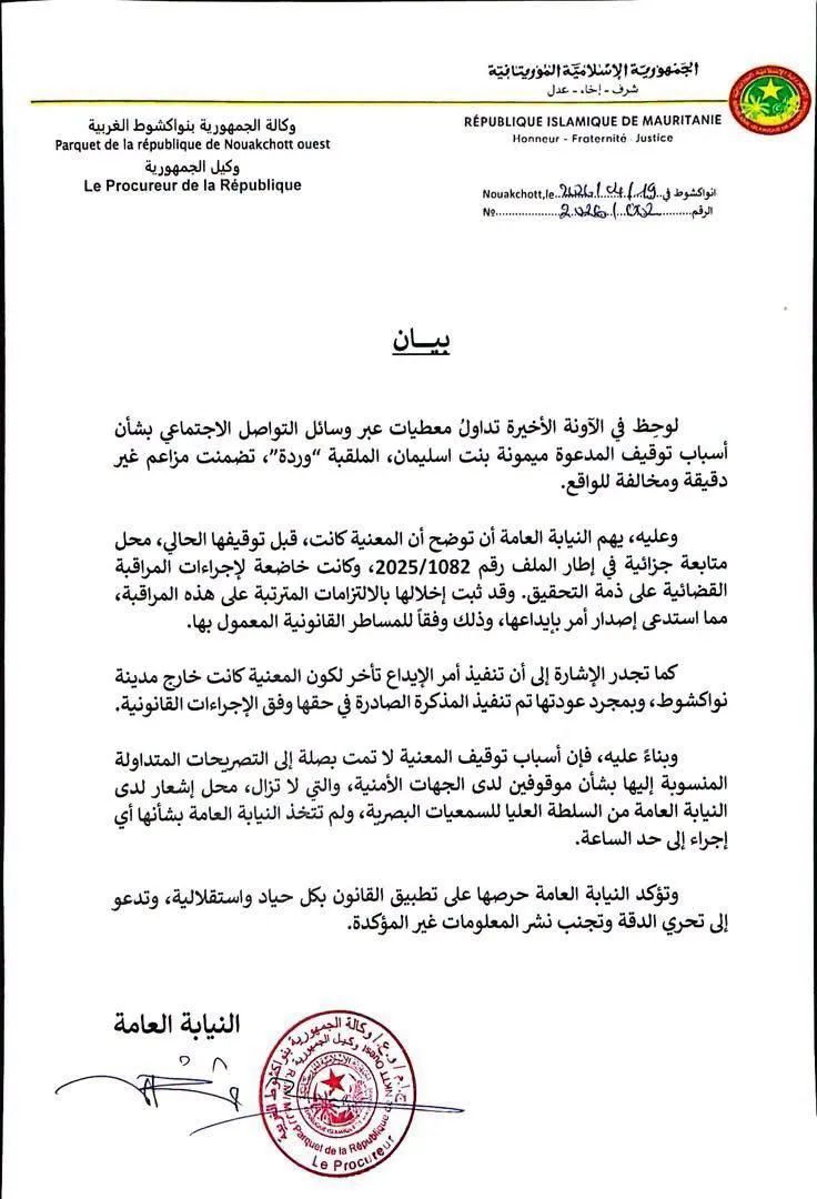 وأشارت إلى أن هذا الإخلال استدعى إصدار أمر بإيداعها السجن وفق الإجراءات القانونية المعمول بها، مضيفة أن تنفيذ القرار تأخر مؤقتًا بسبب وجودها خارج نواكشوط، قبل أن يتم توقيفها فور عودتها.