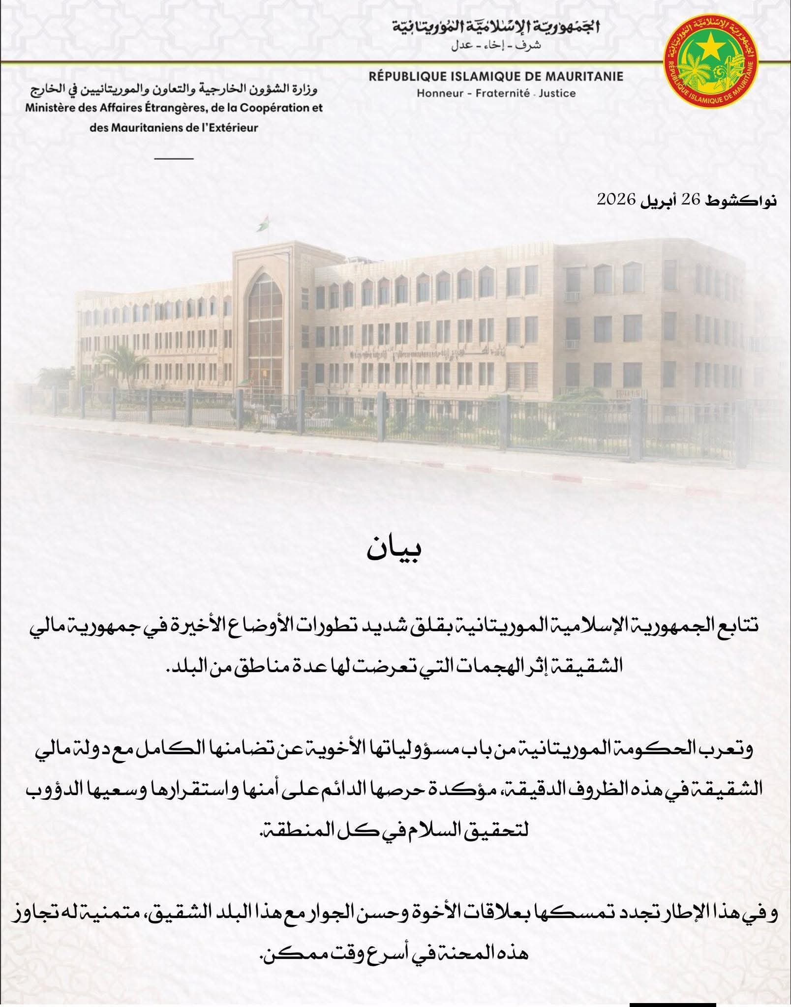وتعرب الحكومة الموريتانية من باب مسؤولياتها الأخوية عن تضامنها الكامل مع دولة مالي الشقيقة في هذه الظروف الدقيقة، مؤكدة حرصها الدائم على أمنها واستقرارها و سعيها الدؤوب لتحقيق السلام في كل المنطقة.